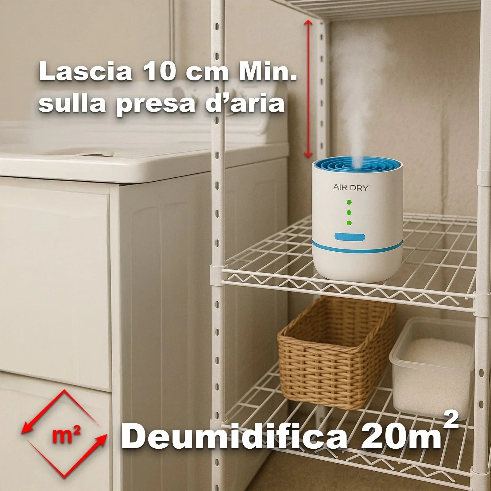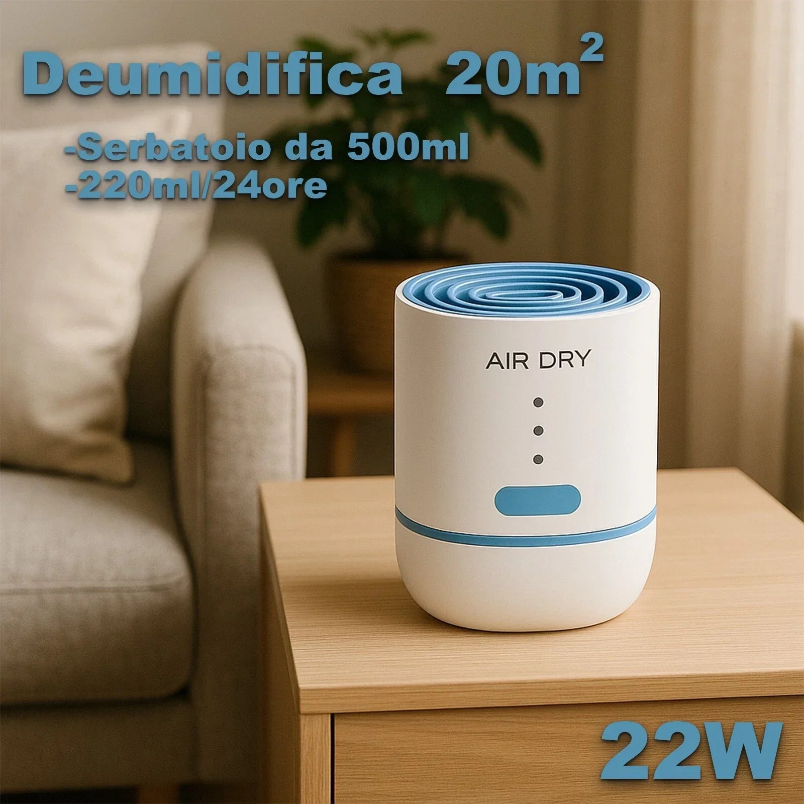 Elimina l’umidità in piccoli ambienti con un consumo energetico di soli 22W, ideale per un uso continuo.