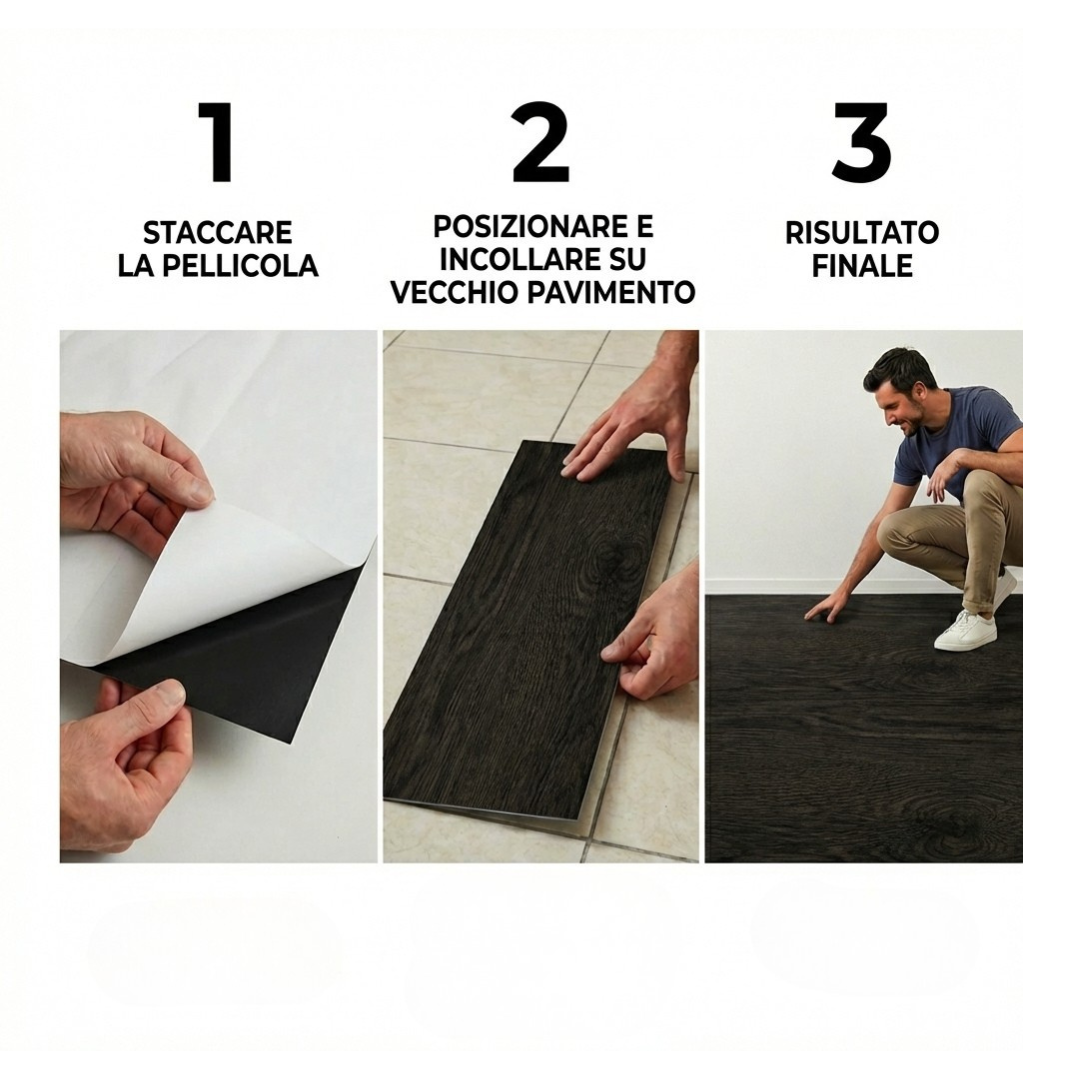 Pavimento in pvc autoadesivo capace di aderire su ogni superficie a patto che sia perfettamente pulita, la colla di cui è composto aderisce fortemente al pavimento sottostante, è sicura al 100%, infatti non è infiammabile e isola dall'umidità sottostante, un prodotto perfetto per ogni tipo di ambiente come cucina, salotto, bagno o ufficio, bar e ristorante.