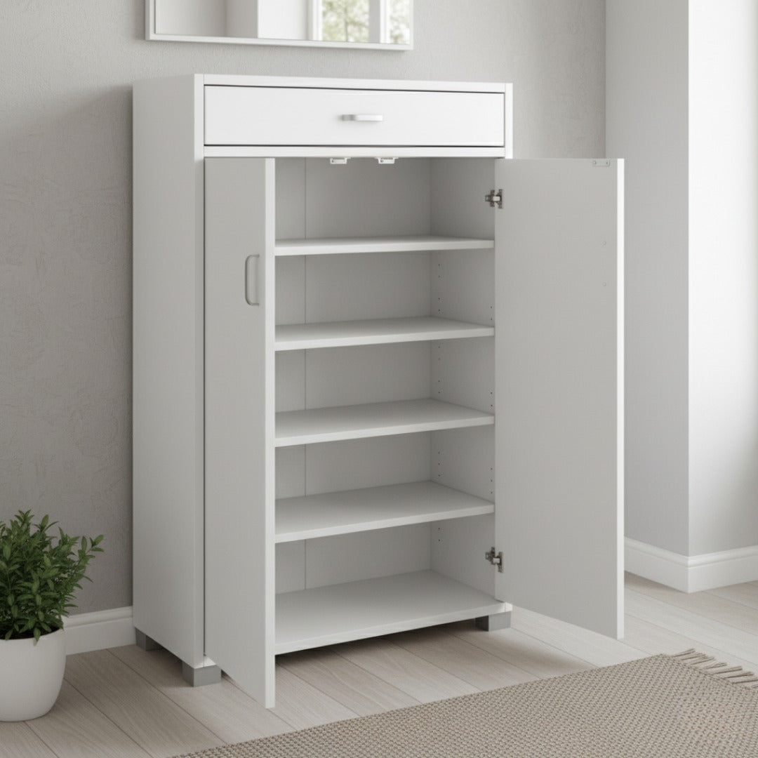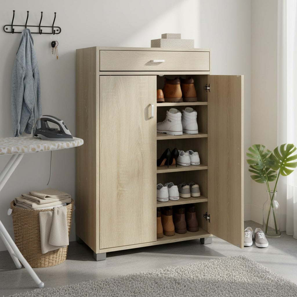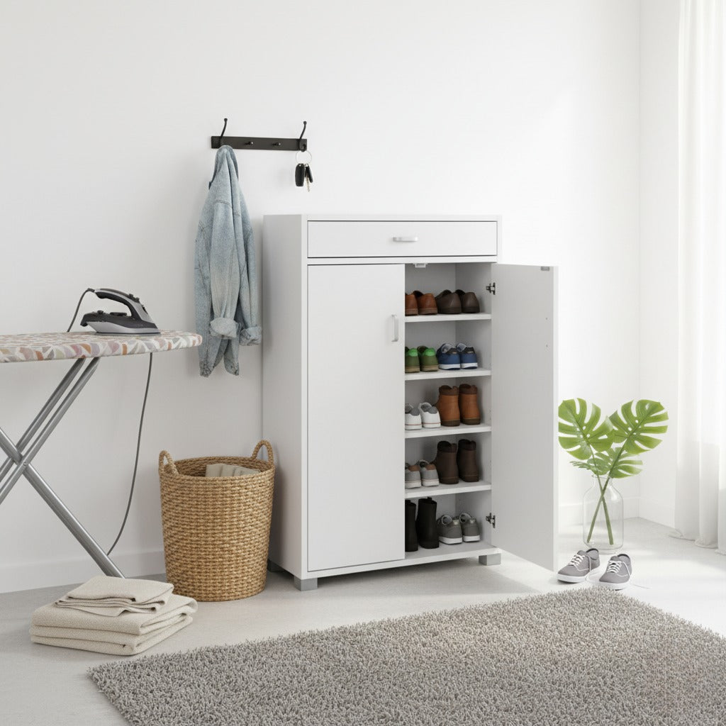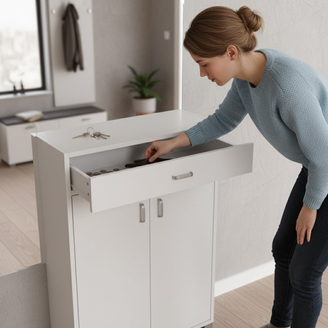 Cassetto superiore integrato ideale per riporre chiavi, accessori o prodotti per la cura delle scarpe.