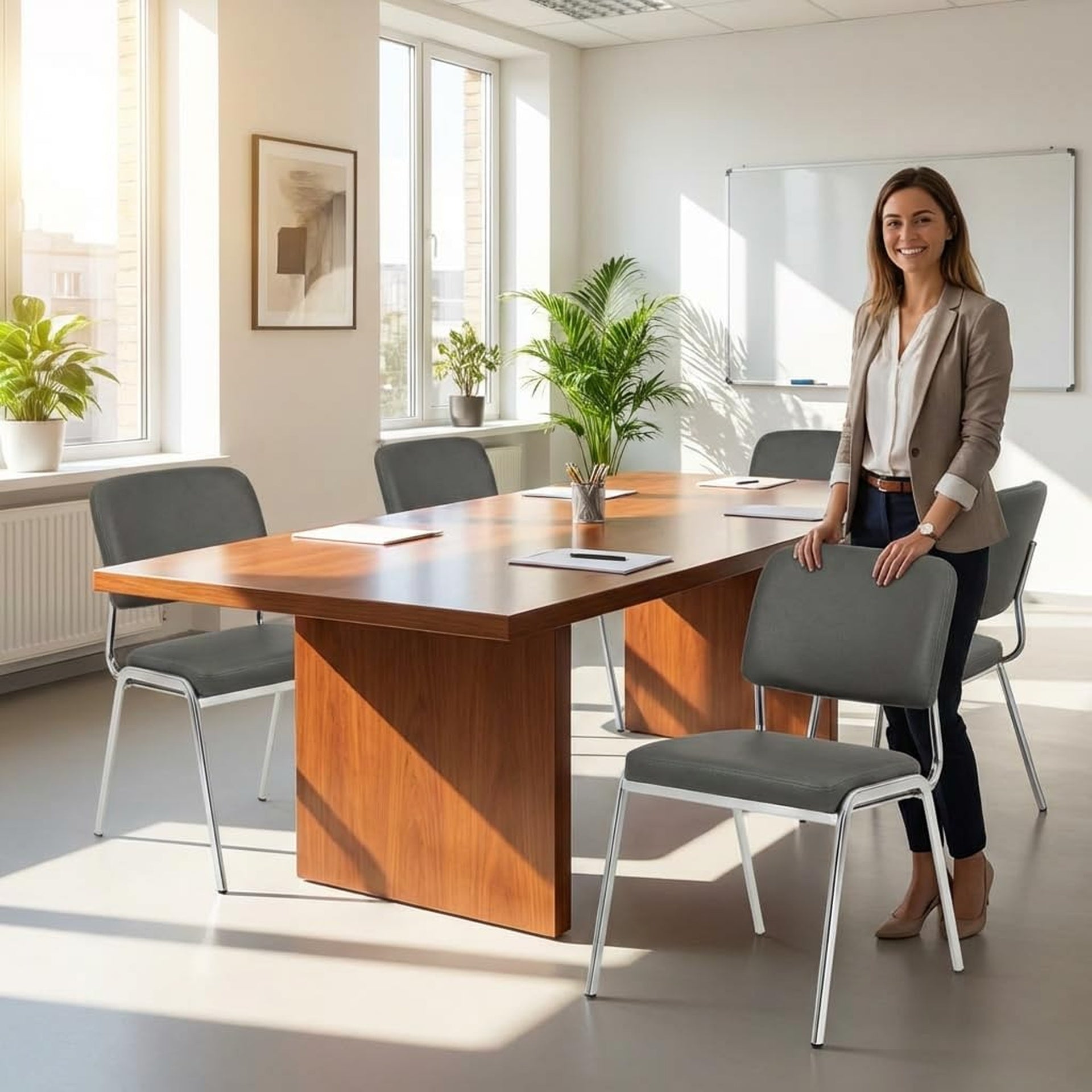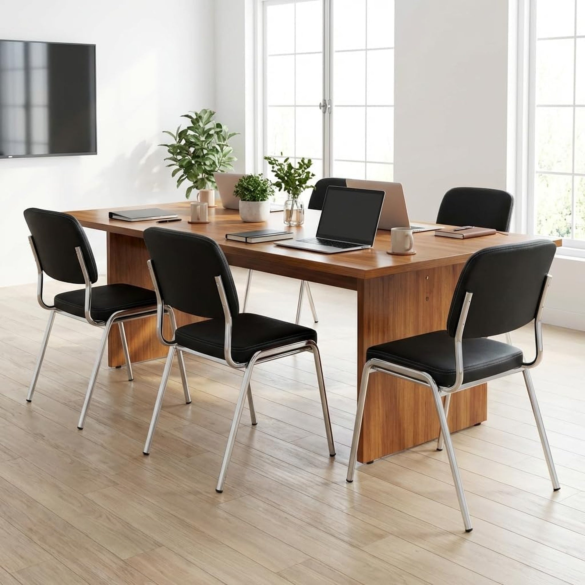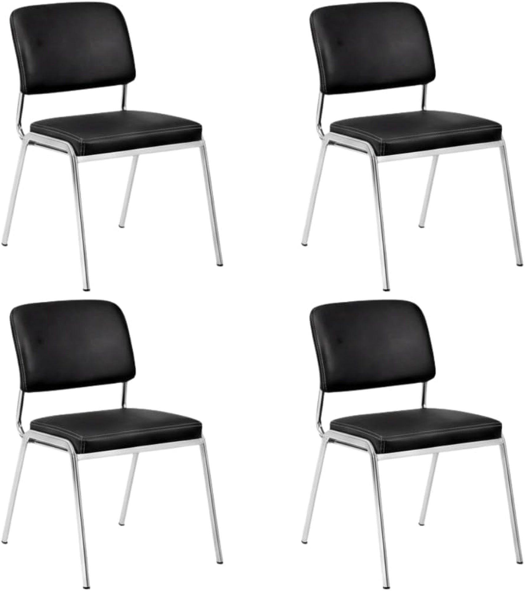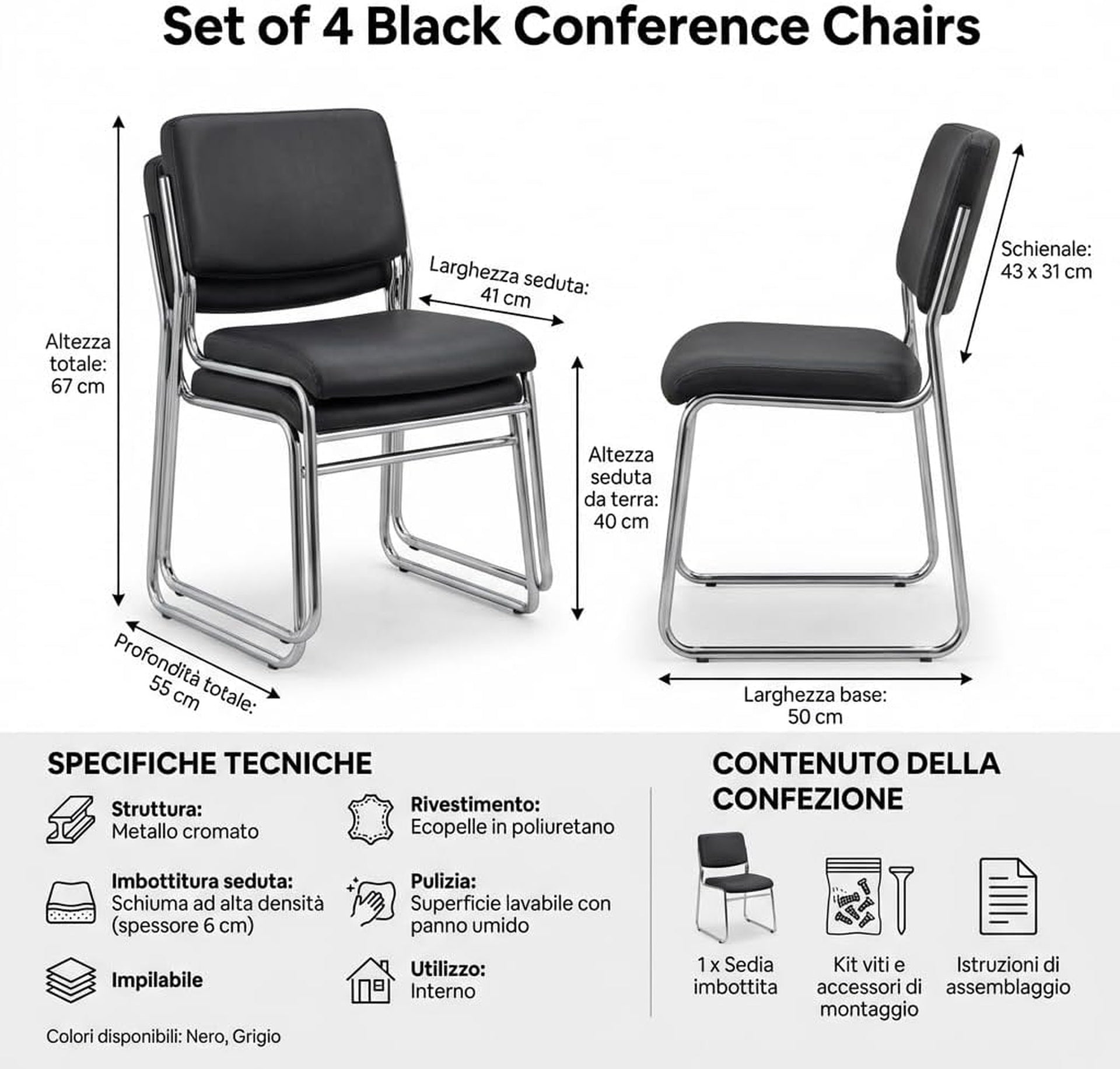 Il set da 6 sedie da conferenza è progettato per offrire comfort, praticità e un aspetto professionale in uffici, sale riunioni e sale d’attesa. Il design impilabile consente di ridurre l’ingombro quando non utilizzate, ottimizzando lo spazio disponibile. La seduta imbottita da 6 cm e lo schienale ergonomico garantiscono una seduta confortevole anche durante riunioni prolungate. La struttura in metallo cromato assicura stabilità e durata nel tempo, mentre il rivestimento in ecopelle è facile da pulire. Le sedie sono fornite già montate, pronte all’uso.