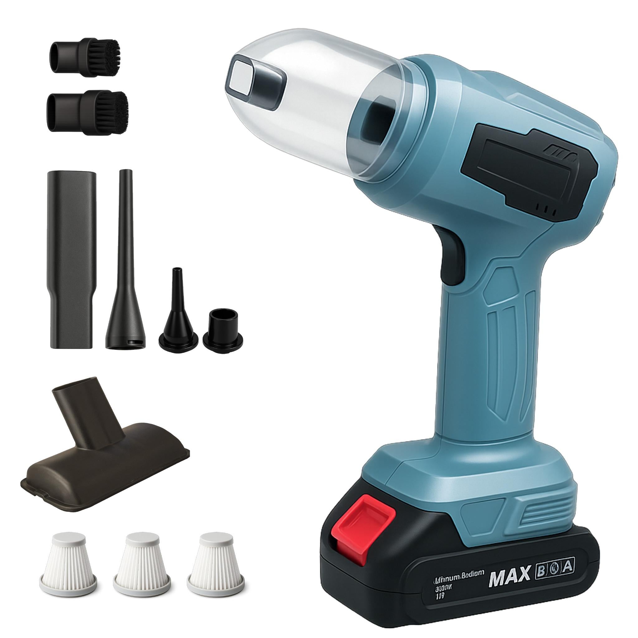 Questo soffiatore-aspirapolvere 2 in 1 offre potenza e flessibilità in un unico dispositivo compatto e leggero. Il motore da 500W garantisce un’aspirazione efficace, mentre la funzione soffiante permette di rimuovere polvere e detriti anche negli spazi difficili. La batteria ricaricabile 48V assicura libertà di movimento e utilizzo prolungato. Il filtro HEPA lavabile mantiene alte prestazioni nel tempo, mentre il serbatoio da 180 ml facilita la gestione quotidiana della pulizia. Con il set di accessori inclusi, questo dispositivo è perfetto per auto, casa, tastiere, divani, prese d’aria, uffici e ambienti professionali.