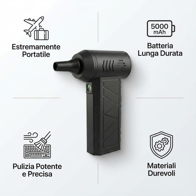 Alternativa ecologica: Evita l’uso di bombolette d’aria compressa, riducendo sprechi e impatto ambientale.