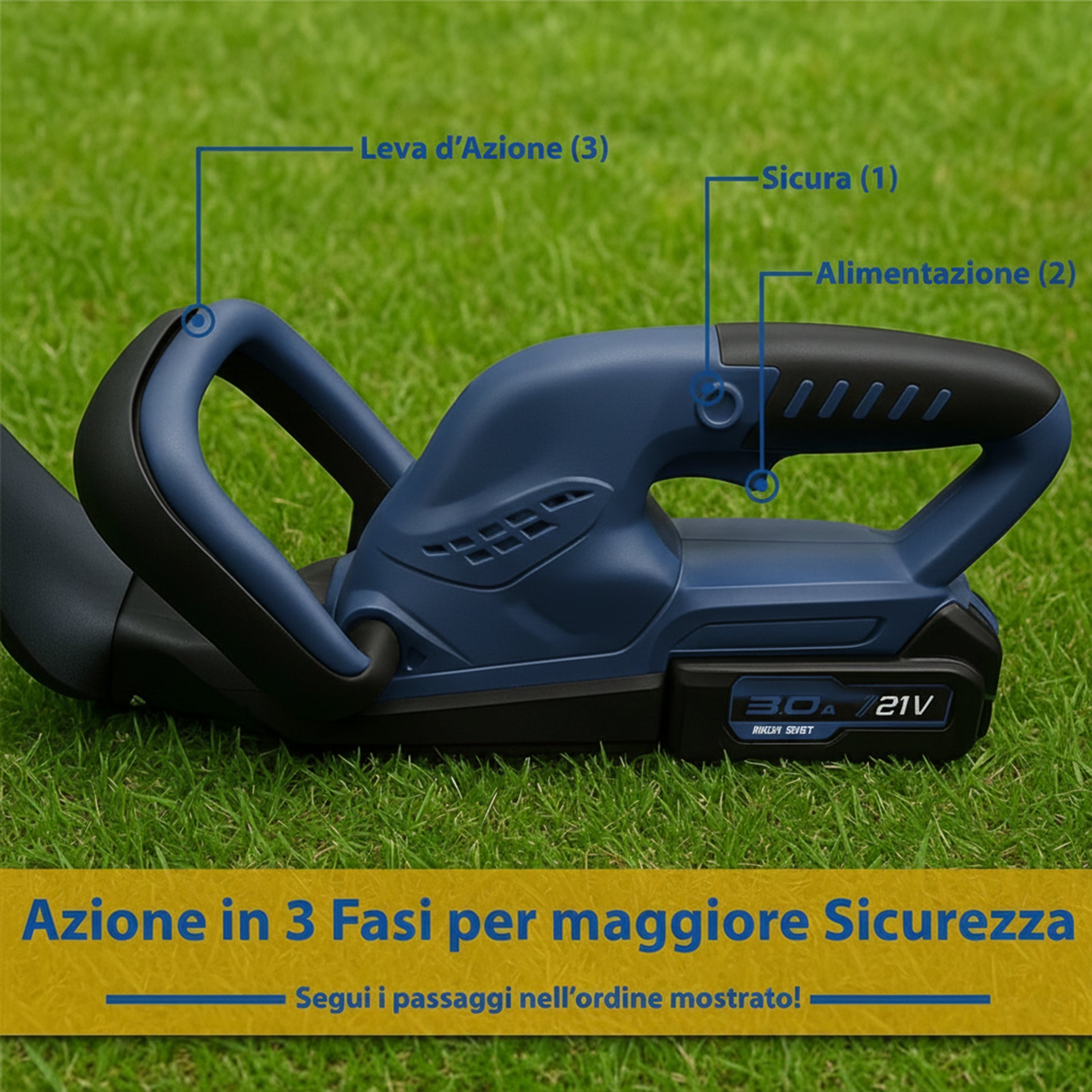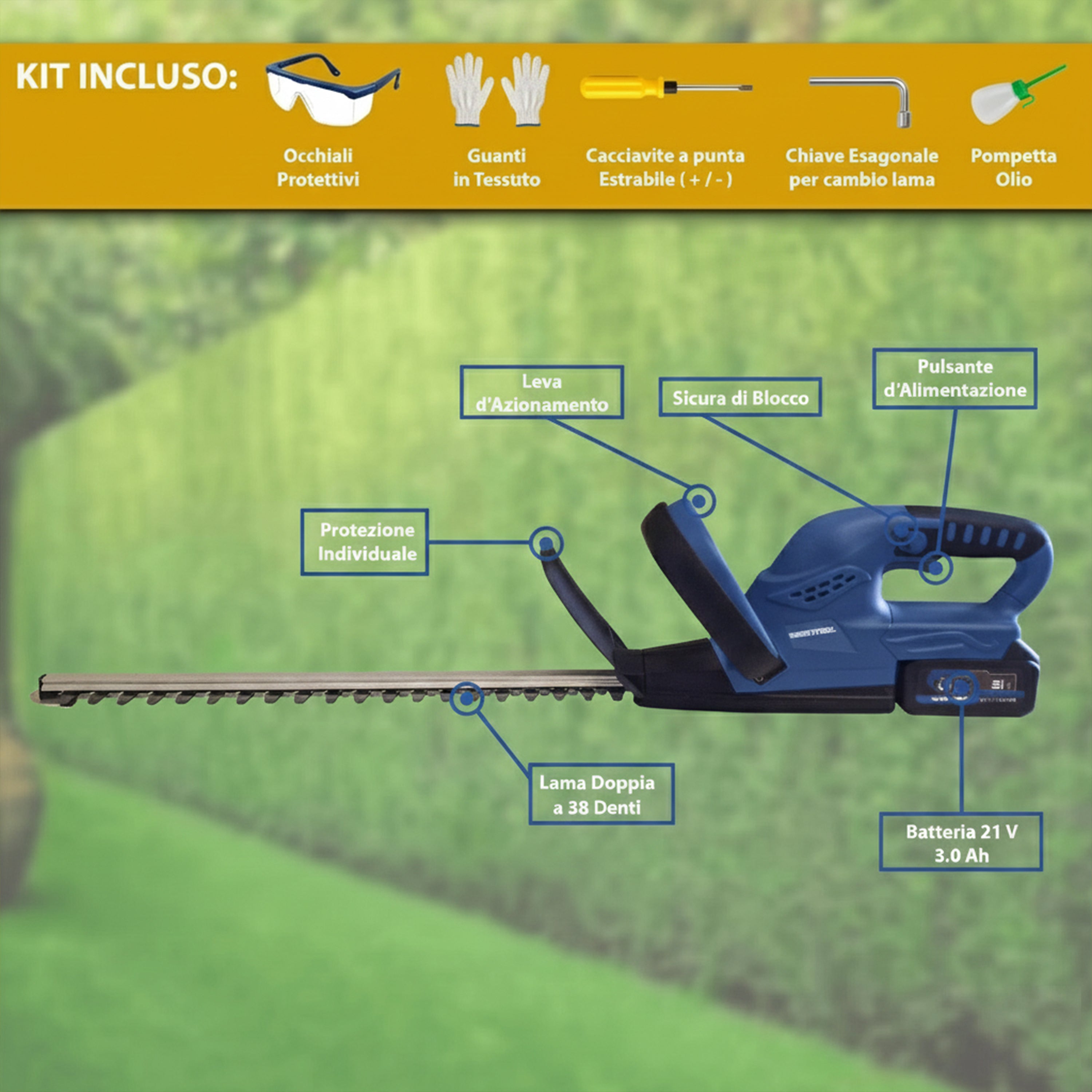 Tagliasiepi a Batteria 21V 3.0Ah con Kit Completo e 2 Batterie